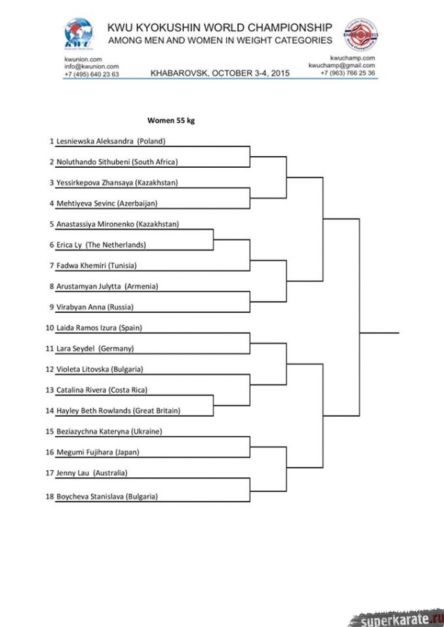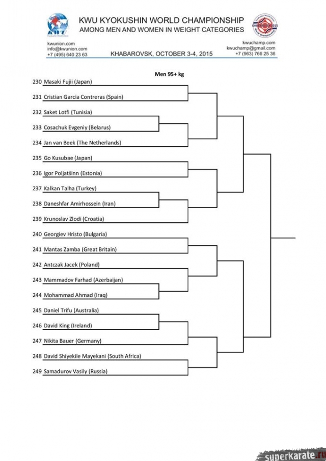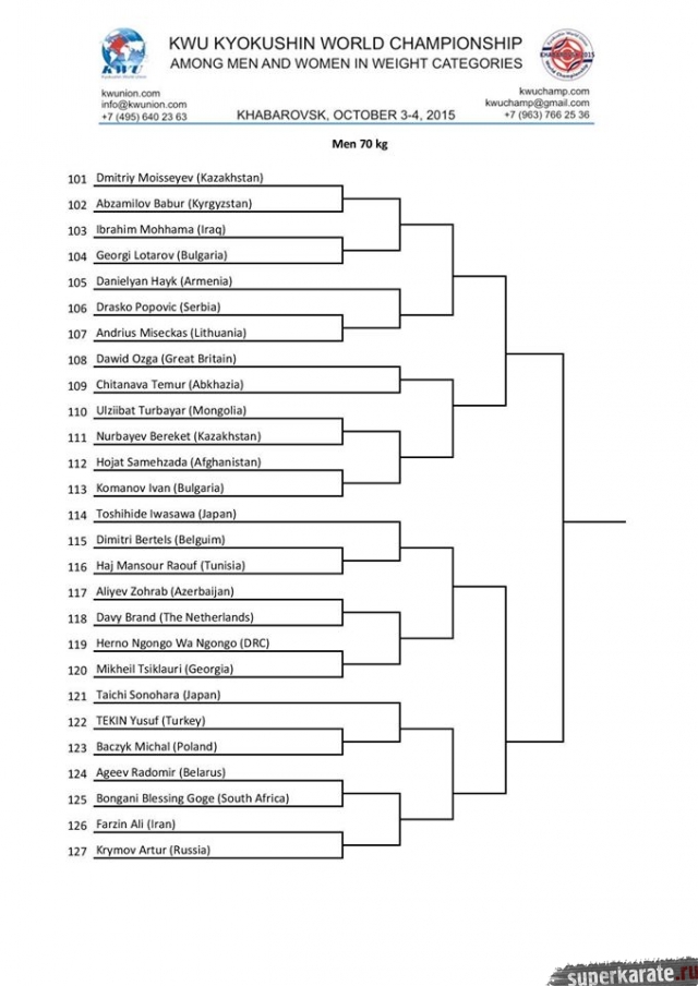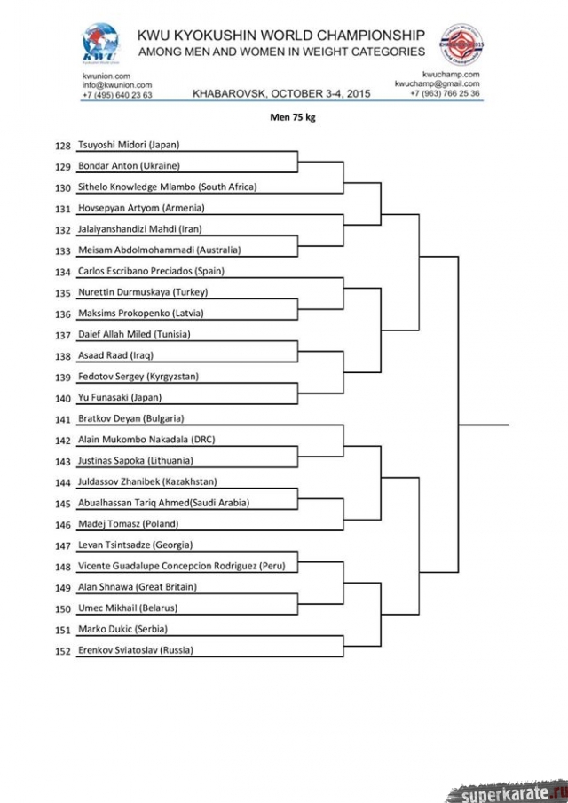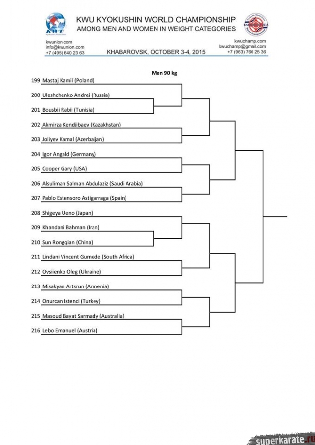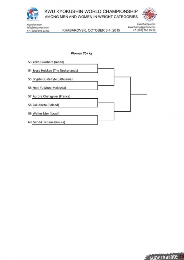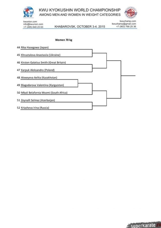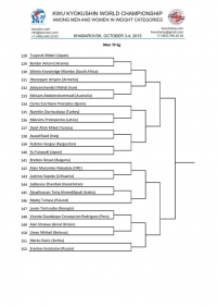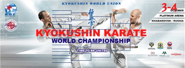 3-4 октября 2015 года в Хабаровске пройдет объединенный Чемпиона мира по киокусинкай (KWU Kyokushin World Championship), среди мужчин и женщин в 14 категориях (9 у мужчин и 5 у женщин). Предлагаем вашему вниманию пули Чемпионата мира.