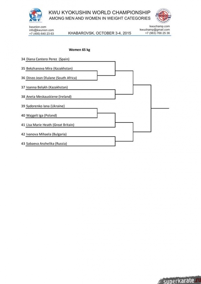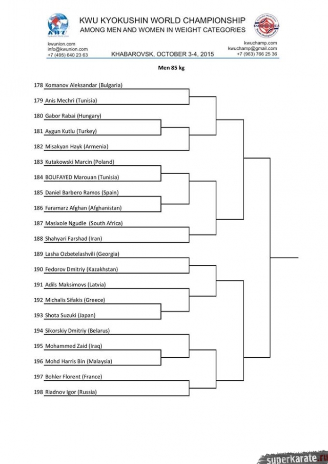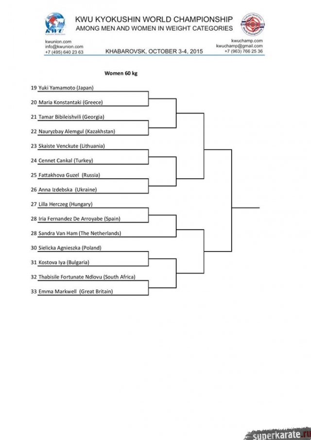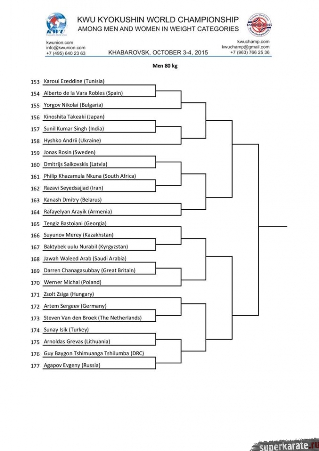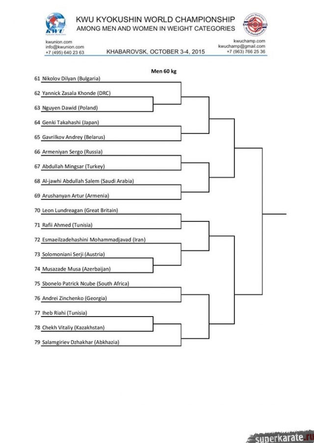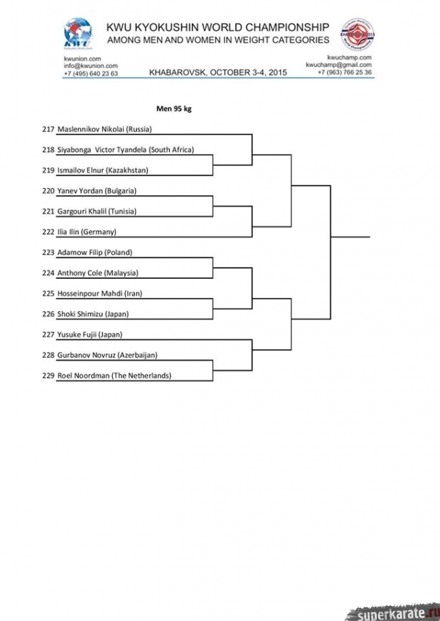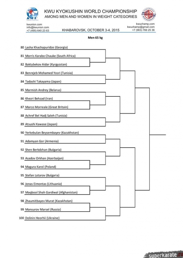 3-4 октября 2015 года в Хабаровске пройдет объединенный Чемпиона мира по киокусинкай (KWU Kyokushin World Championship), среди мужчин и женщин в 14 категориях (9 у мужчин и 5 у женщин). Предлагаем вашему вниманию пули Чемпионата мира.