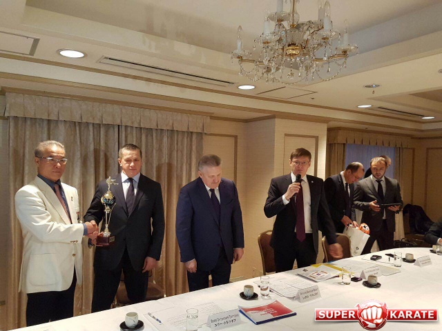В заключительной части совещания состоялась торжественная передача переходящего кубка ЧМ от губернатора Хабаровского Края сопредседателю KWU, президенту KI Канчо Хацуо Рояме.