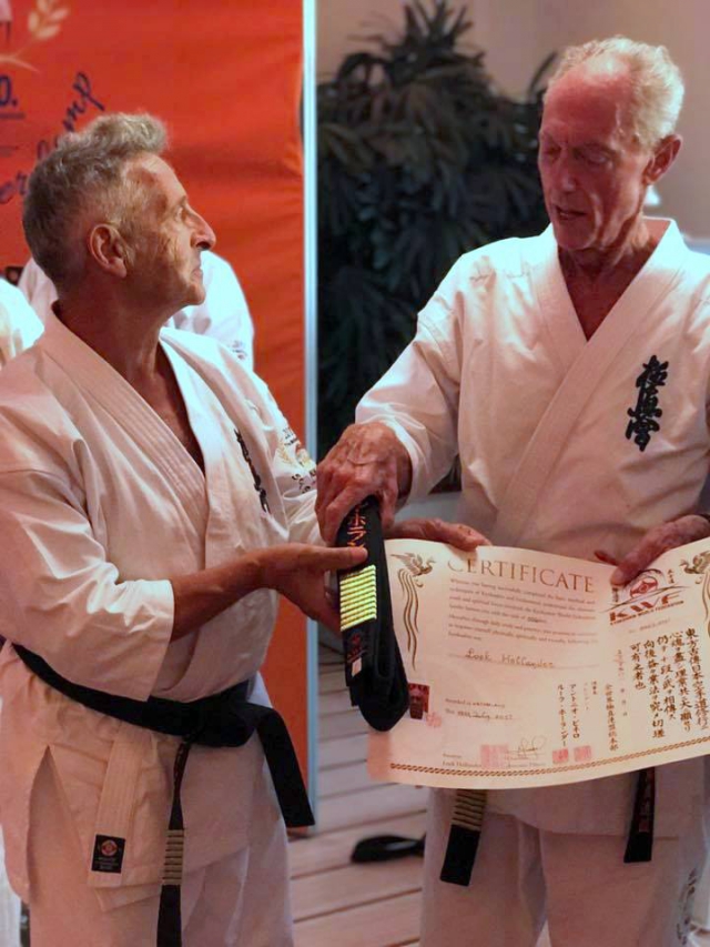 От имени Совета Киокушин Всемирной федерации (KWF) и всех студентов, Шихан Антонио Панейро имел честь вручить Шихану Холландеру черный пояс с десятью золотыми полосками и сертификат подтверждающий 10 Дан.