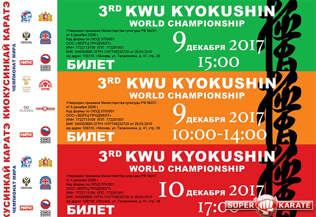 В связи с повышенным интересом к предстоящему в Екатеринбурге 3-му чемпионату мира KWU и ограниченным количеством посадочных мест на арене Дворца игровых видов спорта «Уралочка» (ДИВС), Оргкомитет принимает групповые заявки на входные билеты от федераций в срок до 15-го октября 2017 года.