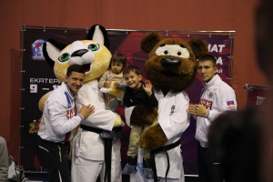 Посмотреть на талисманов чемпионата мира специально приехали несколько десятков юных спортсменов. Не успев зайти в зал и соболиха и медвежонок сразу попали на мастер-класс по киокусинкай от заслуженного тренера России Андрея Буры и двукратных чемпионов мира Евгения Мамро и Марселя Мансурова.
