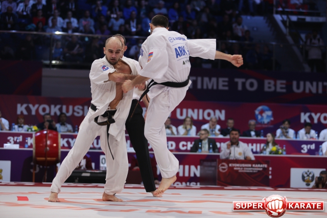 Мужские финалы 3-го Чемпионата мира KWU по киокусинкай стартовали с самой легкой весовой категории до 60 кг, в которой сражались два чемпиона мира Артур Арушанян из Армении и российский боец Фарид Касумов.