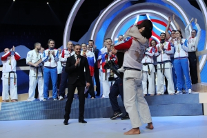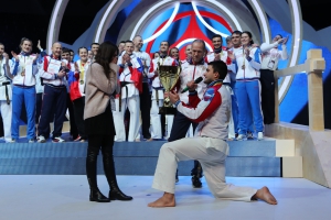 Финальной точкой стал выход всей российской команды и предложение от свежеиспеченного чемпиона мира Станислава Межевцова своей любимой девушке стать его женой.