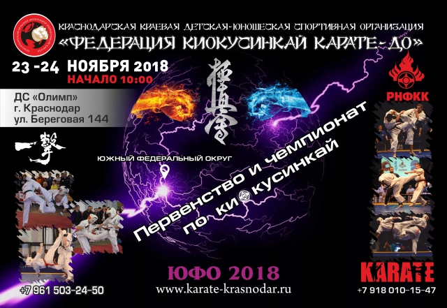23-24 ноября 2018 года в Краснодаре пройдут Первенство и Чемпионат Южно-Федерального округа по Киокусинкай среди юношей и девушек, юниоров и юниорок, мужчин и женщин по кумитэ и ката.