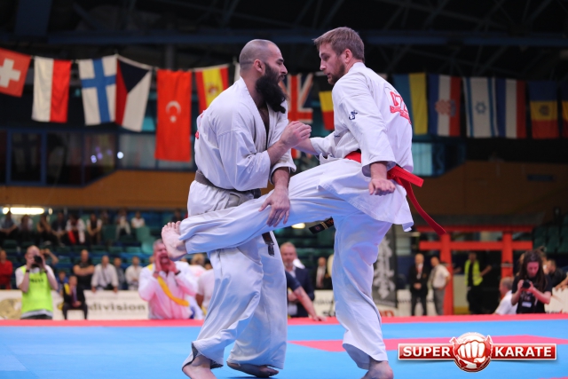 Поединки 33-го Чемпионата Европы по киокушинкай в весовой категории до 90 кг были одними из самых интересных. Особенно жарким получился полуфинальный бой сильнейшего польского бойца Патрика Сыпьена и ненасытного испанца Алехандро Наварро.