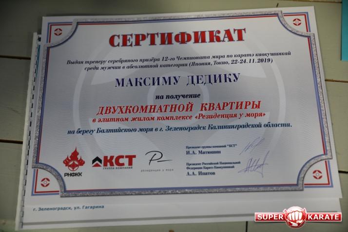 Шихан Александр Ипатов и Президент группы компаний КСТ Игорь Матюшин вручили спортсменам сертификаты на квартиры в элитном жилом комплексе на берегу Балтийского моря и денежные премии.