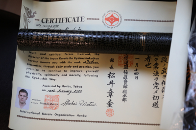 В конце занятий перед фотографированием, от Федерации киокусинкай Калининградской области шихану Александру Ипатову вручили янтарный кандзи вырезанный в крупном куске янтаря и обрамленный серебром.