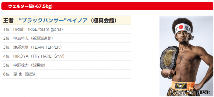 Бей Ноа - действующий чемпион RISE в полусреднем весе (67,5 кг), провел трехраундовый (3х3мин) поединок в средней весовой категории (70 кг).