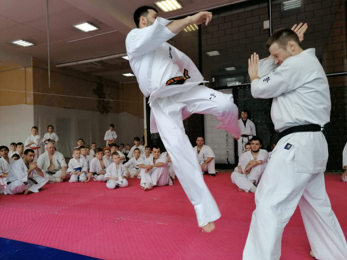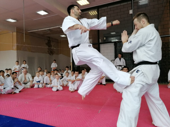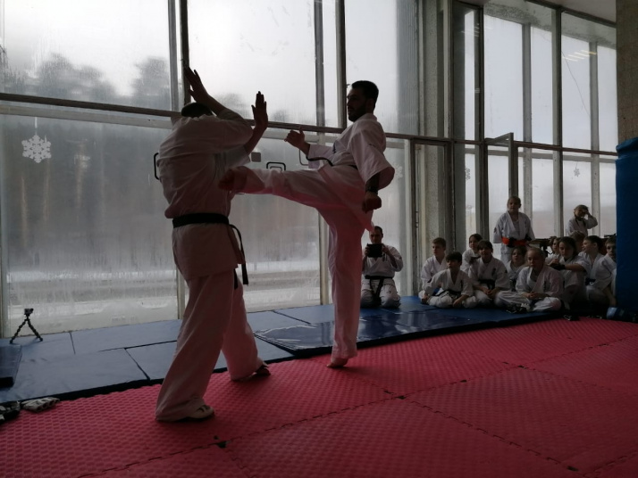 Также Илья Карпенко принял участие в тренировочных поединках со старшими учениками, давая им наглядно убедиться в том, как работает та или иная техника кумитэ.