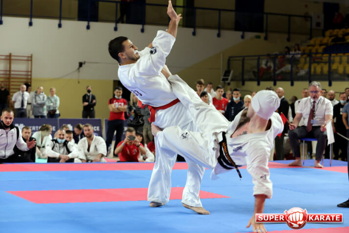 В финале весовой категории 80 кг 34-го Чемпионата Европы по киокушинкай (14.11.2021) бились Лаша Габараев (Россия) и Гжегож Кендзерски (Польша).