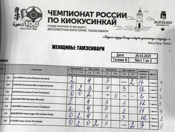 26 марта 2023 года во Владивостоке в финальный день Чемпионата России в абсолютной категории прошли состязания в разбивании досок (тамэшивари).