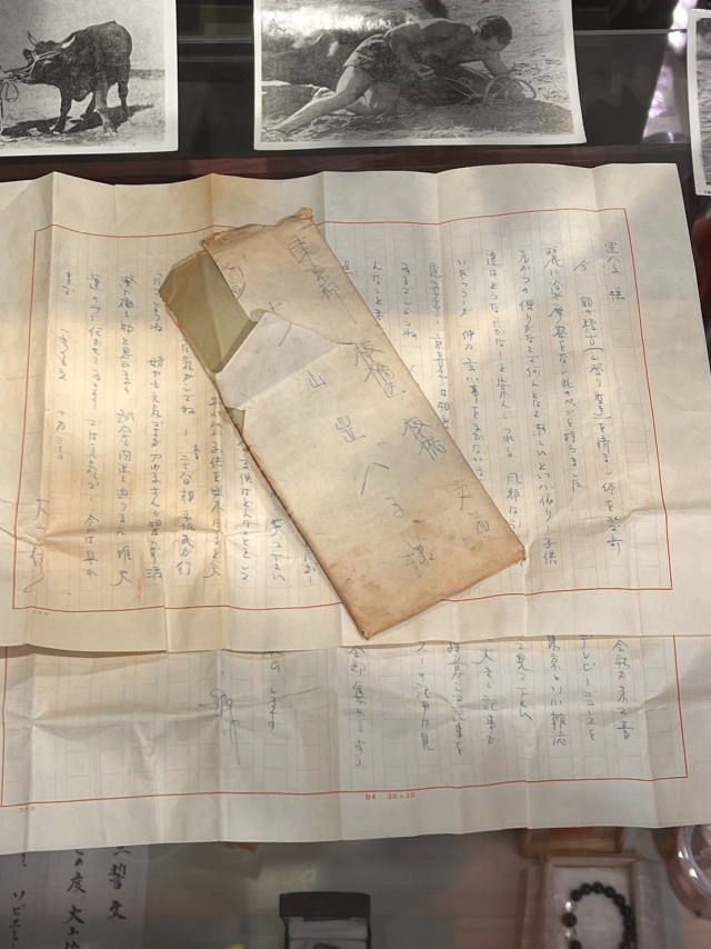 - Рукописное письмо, отправленное Cосаем жене (Чияко Ояма) во время подготовки в горах непосредственно перед решающей битвой с быком