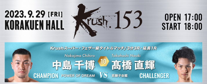 29 сентября 2023 года на Арене Коракуэн в Токио пройдет турнир Krush.153, в главном бою вечера сразится Чихиро Накаджима (Chihiro Nakajima) - победитель 34-го чемпионата Японии по киокушинкай.