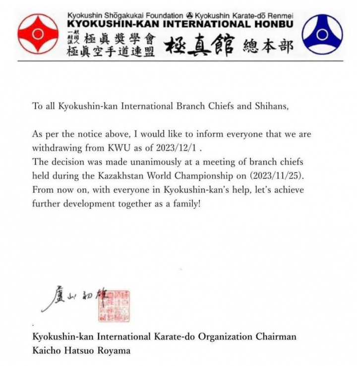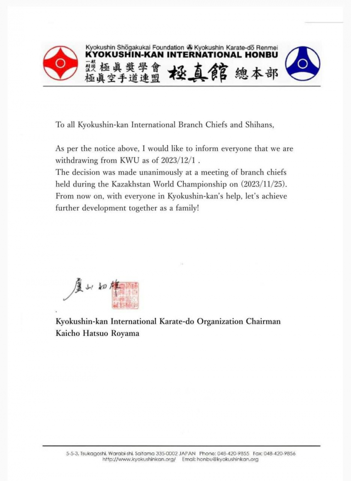 1 декабря 2023 года Международная Организация Кекусин-кан (Kyokushin-kan International) официально объявила о своем выходе из KWU, учредителем которой являлась с момента создания.