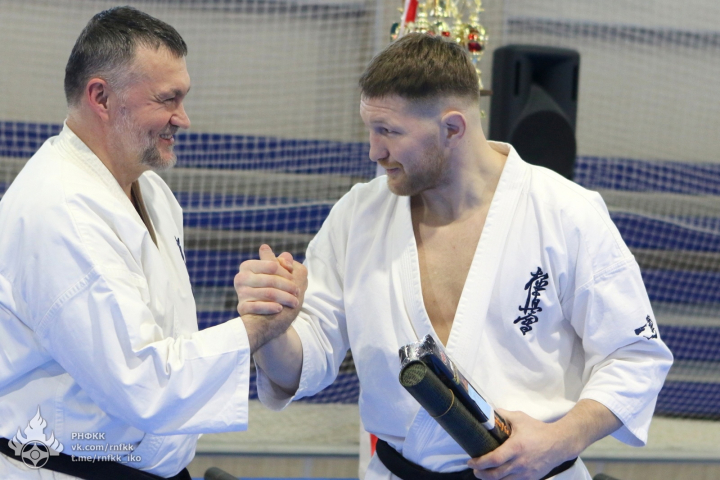 На экзамен заехал Владимир Минеев, находящийся в краткосрочном отпуске. Ему вручили 2 дан, на который он аттестовался на Летней школе РНФКК в Алуште.
