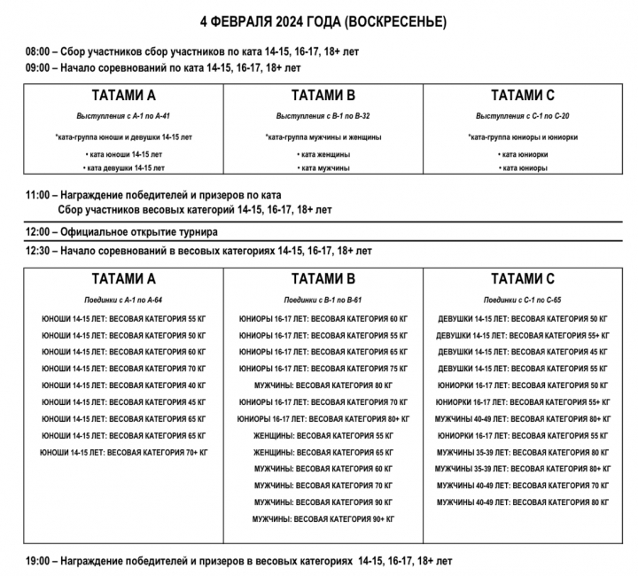 На татами выйдут юноши и девушки 14-15 лет, юниоры и юниорки 16-17 лет, мужчины и женщины, ветераны.