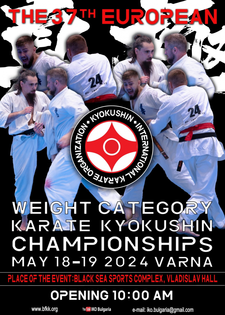 18-19 мая 2024 года в Варне, Болгария, проходит 37-й Чемпионат Европы по киокушинкай в дисциплинах ката и кумитэ / The 37th European Weight Category Karate Championships.