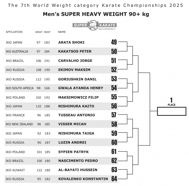 Самый легкий спортсмен японец Нишимура Таига (92 кг), самый тяжелый боец Аль-Баяти Хуссейн из Кувейта (122 кг).