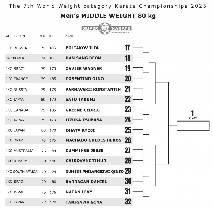 Поляков Илья, Варнавский Константин и Чиковани Тимур сразятся на 7-м весовом Чемпионате мира по каратэ киокушинкай (The 7th World Weight Category Karate Championships 2025) в весовой категории 80 кг.
