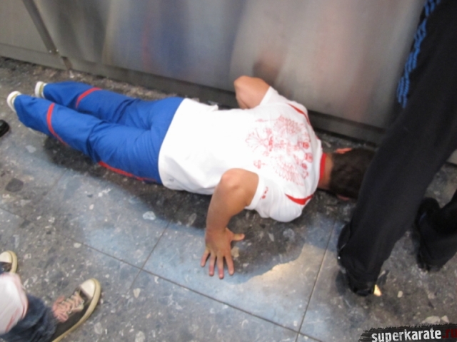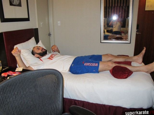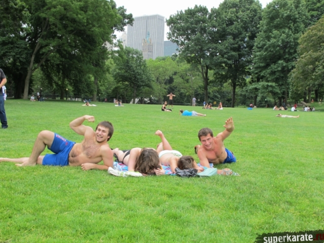 Так как приехали на соревнования, то как же обойтись без тренировки. Но найти достойное места для тренировки оказалось не просто, тренерский совет сходил на разведку на набережную, присматривали и детскую площадку, но... Выбрали место у уже закрывшегося на сегодня банка. Никто не виноват, что ближайшая пригодная для тренировки площадка оказалась на углу оживленного перекрестка. Останавливающиеся прохожие и собиравшиеся зрители не могли помешать тренировочному процессу... но смог секьюрити, который ошалел от вида молотящих воздух молодых, здоровых спортсменов, сбегал за подмогой и прогнал нас когда стал демонстративно звонить в 911. Но разогнавшихся бойцов трудно остановить, бегом форсировали улицу и продолжили тренироваться уже у другого здания. И снова вредные секьюрити пристали к тренерам, пришлось оставить и эту площадку, когда дотренироваться осталось самую малость. Эту малость, которой оказалась набивка, закончили прямо в отеле, в коридоре четвертого этажа, где как на зло движение жителей было немногим меньшим, чем чуть ранее на Бродвее. Без приключений было бы наверное не так интересно.
