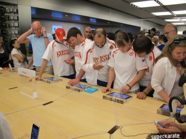 Но самый больший ажиотаж и эмоциональный отклик у сборной России вызвал фирменный магазин Apple, в котором к разочарованию многих, оказалось невозможно купить четвертый айфон за 300 долларов, без контракта он стоит 650 у.е. и не баксом меньше.