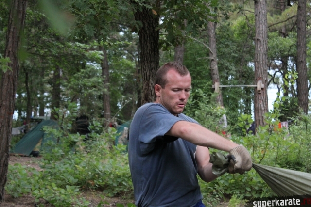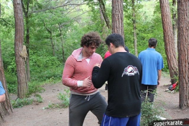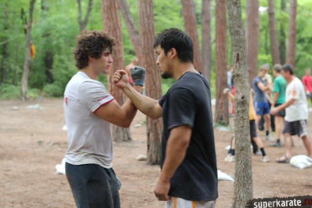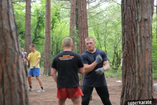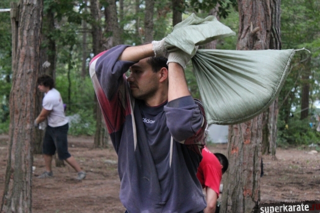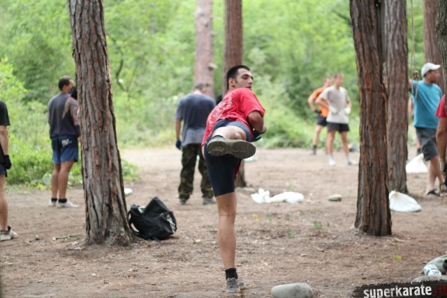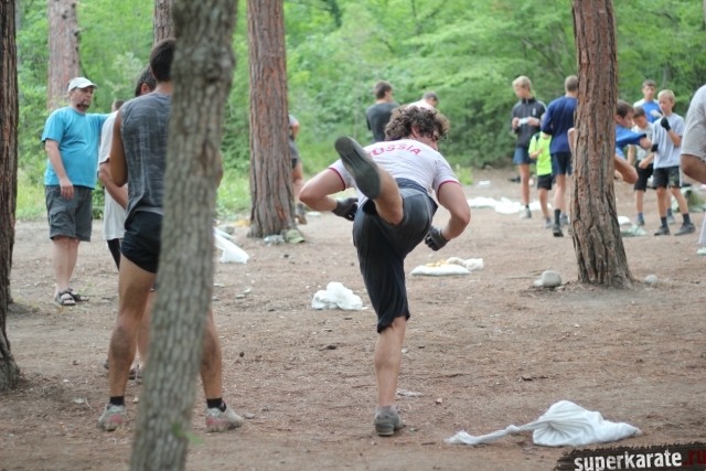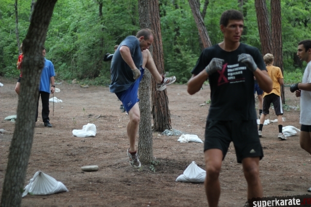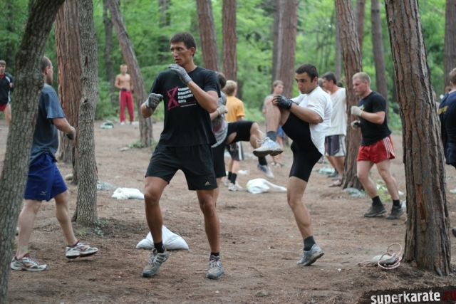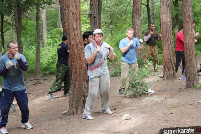 На первой тренировке дается все разнообразие взаимодействия с природой, которое свойственно сборам шихана Алымова. Здесь и работа с камнями, и перемещения с ударами в гору, работа с деревьями и на канатах, мешки и набивка. Главная особенность утренней тренировки, это ее кажущаяся бесконечность...