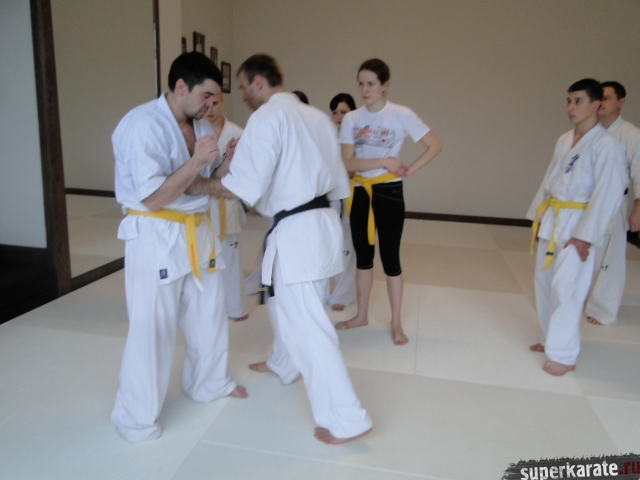 Очень интересная была работа в кумите. Здесь кумите – не просто свободный бой. Главное – отработка принципа. Оттяжка, уход с линии атаки с входом в противника, работа на дистанции, работа в клинче. На каждую тему давалось свое задание. Работа была настолько интересной, что подтянулись и те, кто был намного младше поясом, и те, кто присел отдохнуть, только что показав ката. Связки порой были даже опасные, но никто не травмировался. Несмотря на усталость, ребята были внимательны и аккуратны.