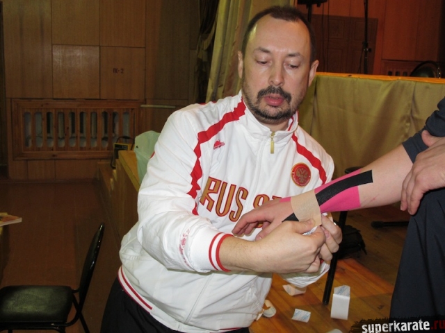В рамках семинаров доктор Прошкин познакомил участников инструкторских сборов с наиболее современным и эффективным оборудованием спортивной медицины. И дал практикум по спортивному тейпированию.