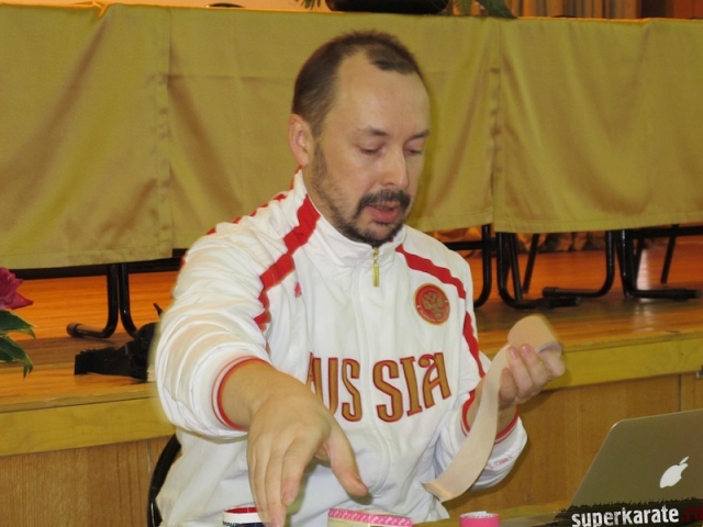 В теоретической части семинара доктор рассказал о базовых принципах тейпирования и его разновидностях, от страхующих эластичных тейпов, до жестких фиксирующих, которые вполне могли бы заменить гипс.