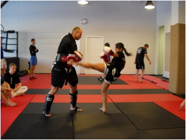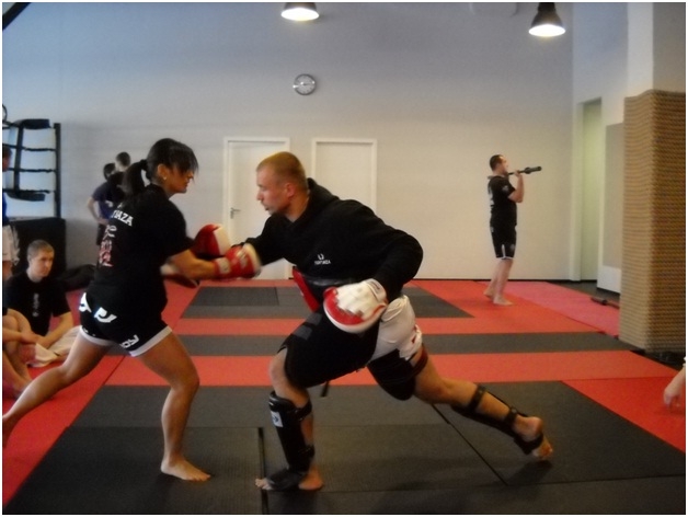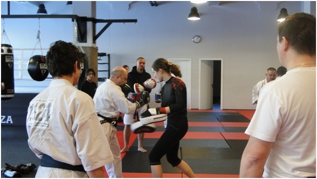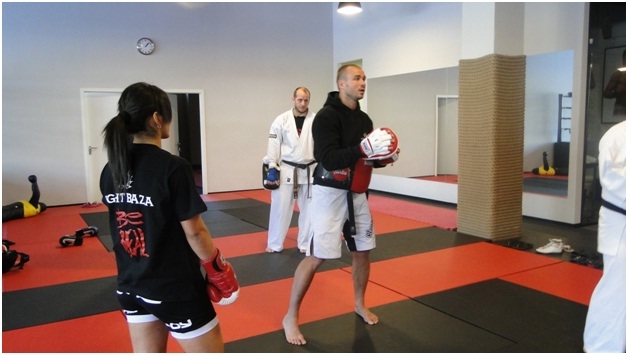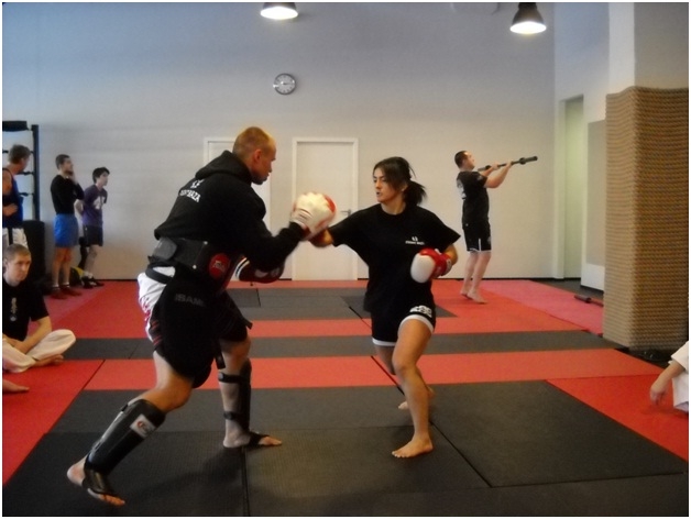 Мы выполнили большой объем работы в течение трех с половиной часов, включая упражнения на целостность удара, замки, комбинации с ударами руками и ногами. Дина и Максим подходили к нам, показывали, как правильно держать снаряды, как принимать удары, работать с партнером.