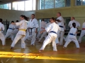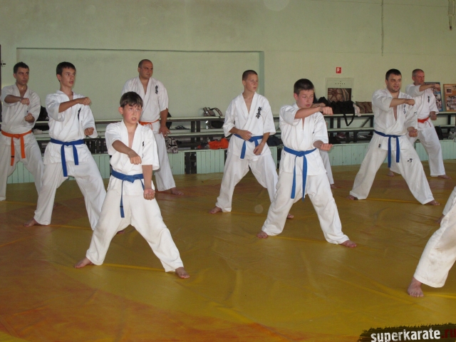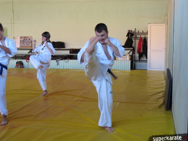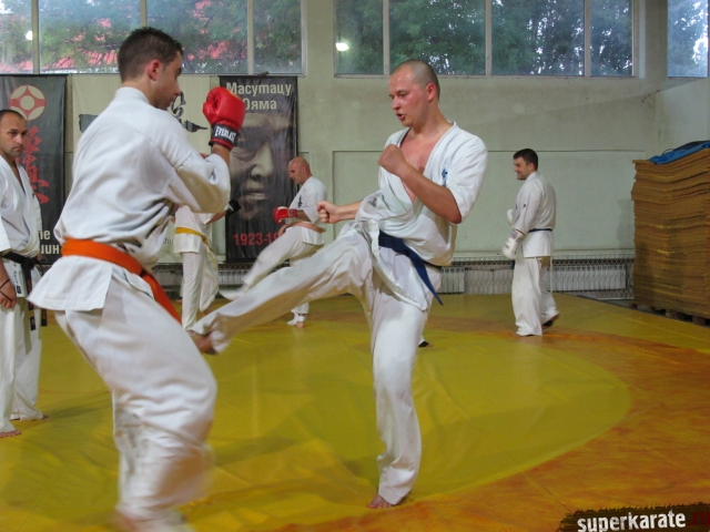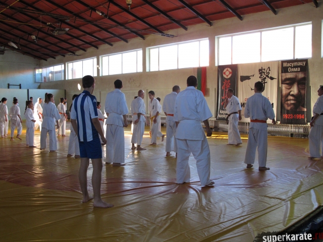 В принципе все четыре группы тренировались по традиционной киокушиновской схеме. Так как размеры залов позволяют, тренировки начались с беговых упражнений, затем кихон на месте, работа в перемещении, ката, физподготовка и кумитэ.