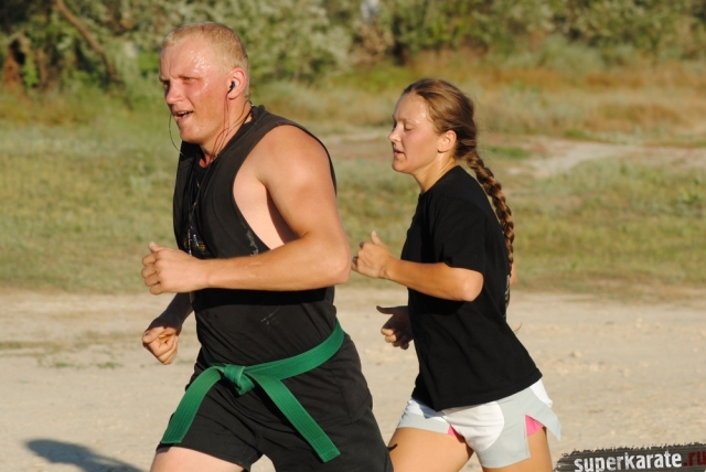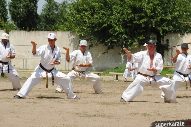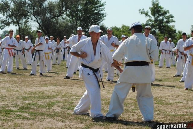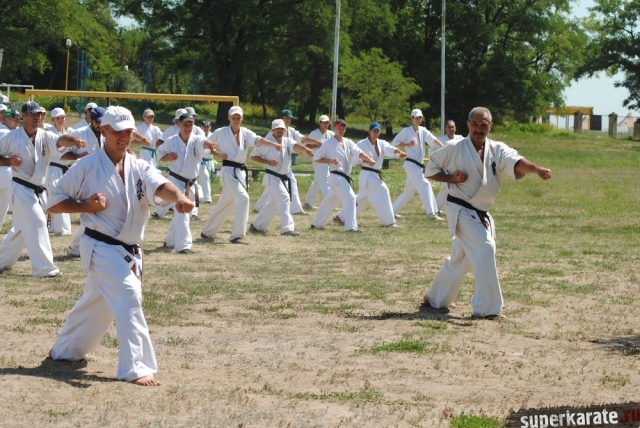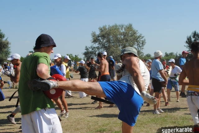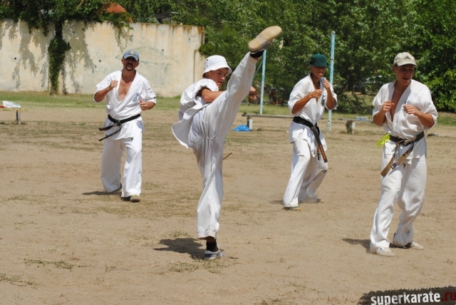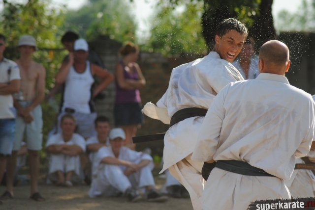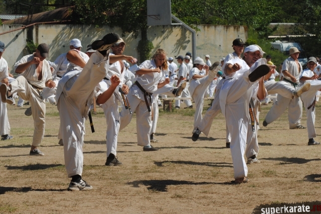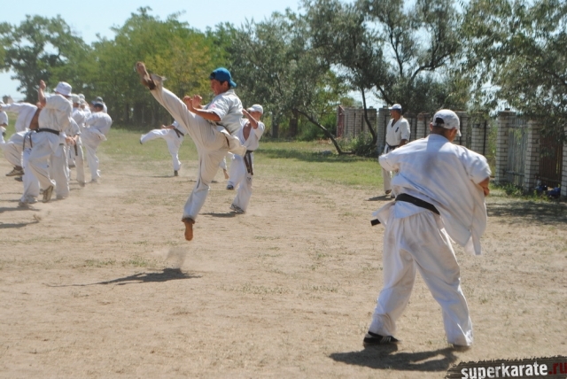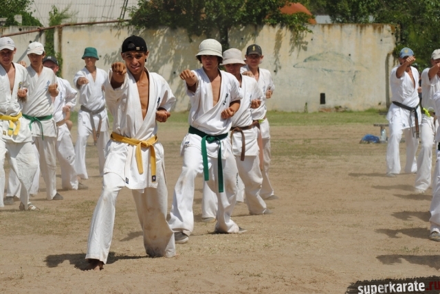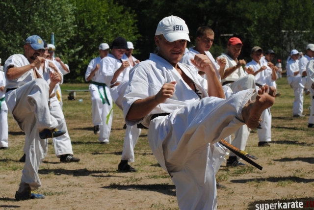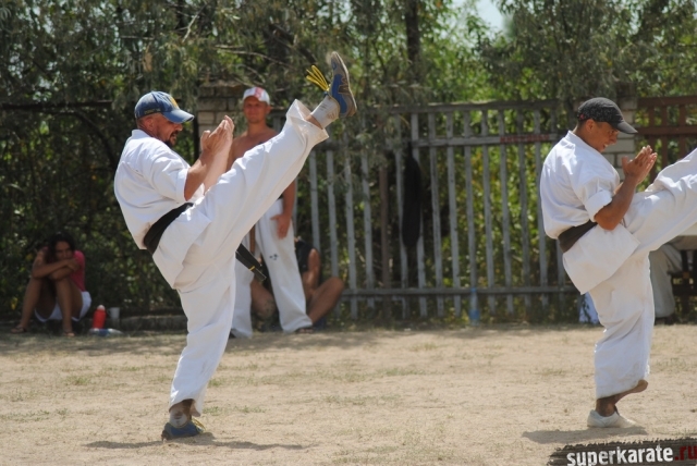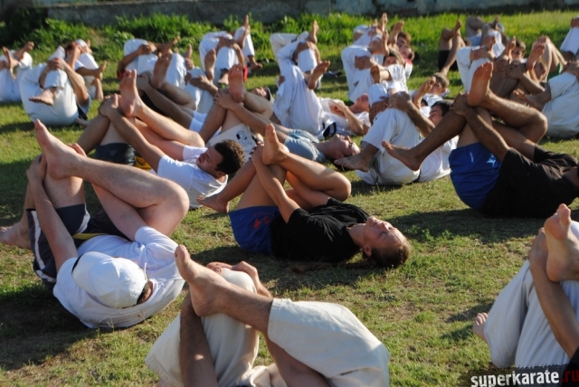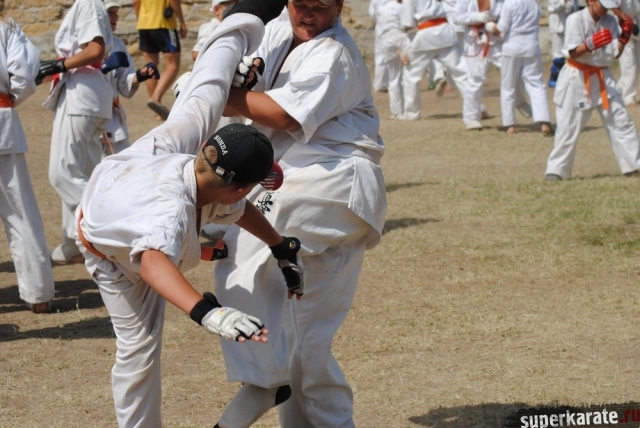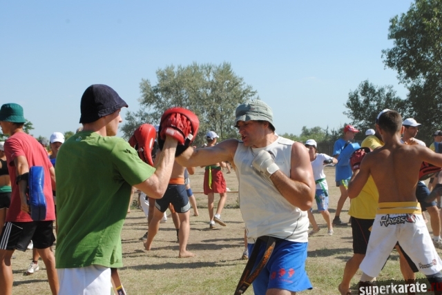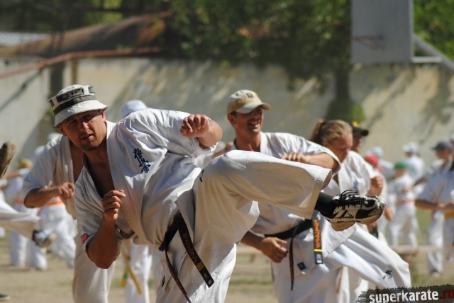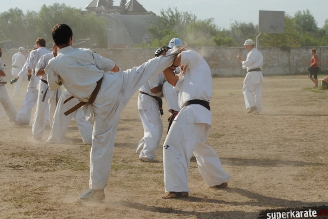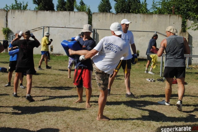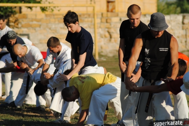 Утром каждый занимался своим делом. Малыши шли на зарядку и управлялись в гибкости и упражнениях на растяжку. Старшие под руководством Шихана Всеволодова изучали Бункай и отрабатывали его применение. Сборники, возглавляемые то Сенсеем Семеном Гараном, то Сенсеем Дмитрием Прасоловым «разминались» в функциональной подготовке – километрами беговых упражнений, сотнями прыжков и выпадов, маваши, уширо-маваши и их комбинациями, а в окончании перемещались на тренировку бункай и на расслабляющие упражнения на гибкость суставов, которые специально разработал для уставших ног спортсменов шихан Всеволодов.