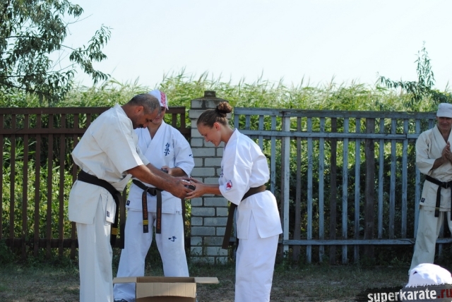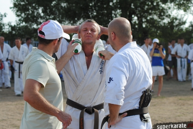 Особое внимание стоит уделить все тому же Эльдару, который сначала отбивал коричневые пояса, потом отстоял своих 10 боев, а затем еще остался на 20 боев вместе со сдающими на 2- й Дан – отличная возможность проверить спортивную форму, выносливость и силу духа. Ну и, конечно же, кульминацией всего сбора стали 40 боев Сэнсея Дмитрия Прасолова, который в ноябре 2011 года успешно прошел тест на 4-й Дан в Мицумине, но по нехватке времени, отведенного под экзамен, прошел лишь сокращенный кумитэ-тест. Шихан Всеволодов решил исправить эту несправедливость и дать возможность Дмитрию полностью ощутить себя обладателем заветного пояса и пройти этот тест на Родине.