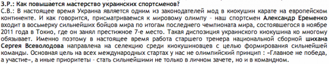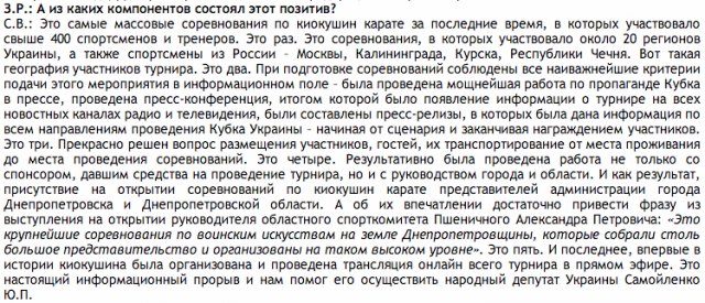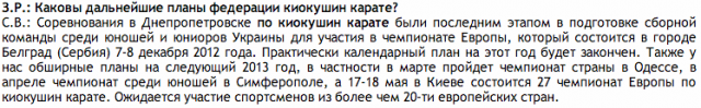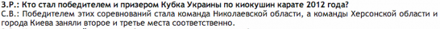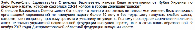 Что же касается информационного обозрения турнира - так нигде, кроме как на сляпанном ресурсе, носящем одноименное название с крупнейшим сайтом о боевых искусствах и являющемся позорным плагиатом – этого обозрения не было. Более того, данный сайт не только очередная, непонятная всем, бредовая идея…, он является полной профанацией и плодом воображения человека, который его создал. Все новости, которые публикуются и все интервью пишутся самим Станиславом Васильевичем Близнюком. Он считает, что имеет право выражаться от имени спортсменов и тренеров. А делается это, скорее всего, с одной целью – заявить о себе, о своем величии и значимом вкладе в дело развития Кикушин каратэ во всем мире. Только всем видно, что не тем путем это делается.