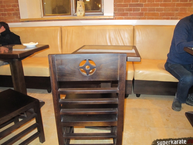 На первом этаже есть приятное кафе с киокушиновской стилизацией, в котором смогут встречаться и питаться люди посещающие Доджо.