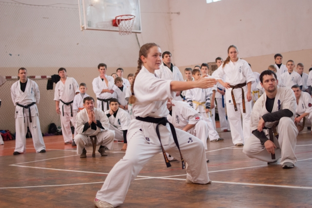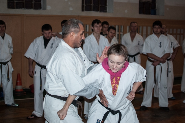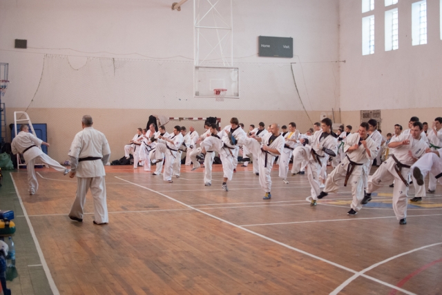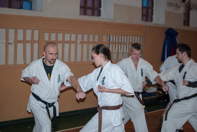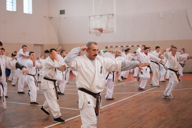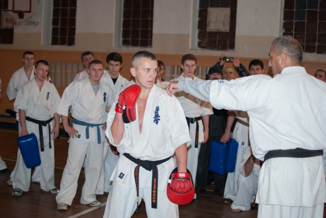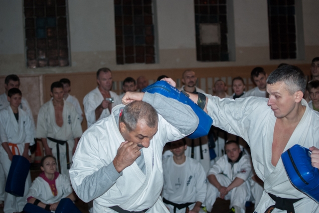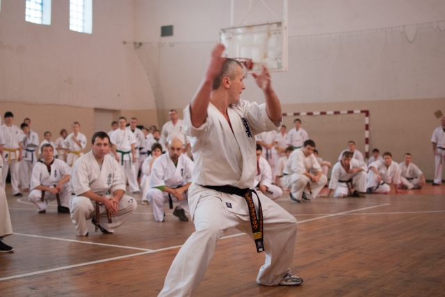 Тем у 7-й Школы было две. Первая – это детальный разбор соревновательных ката (Гекусай-шо и Сушихо). Шихан показал несколько вариантов исполнения каждого ката, а именно соблюдение правильного темпа, выделение связок и расставление акцентов на отдельных движениях. Обратил также внимание всех, кто практикует себя в судействе соревнований на ошибки, встречающиеся при исполнении этих ката. Также был разложен бункай основных элементов.
