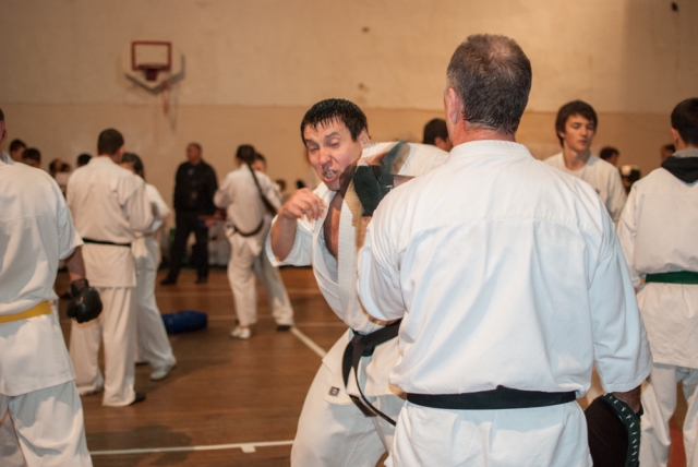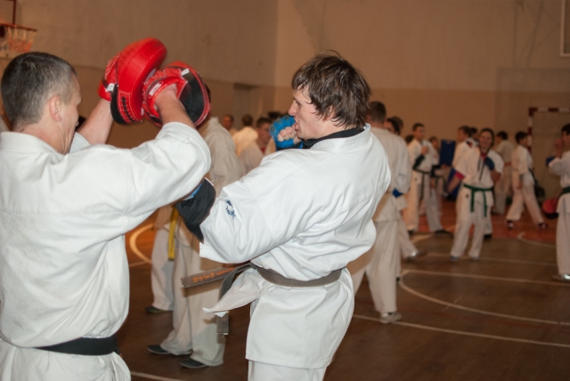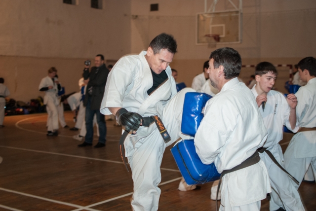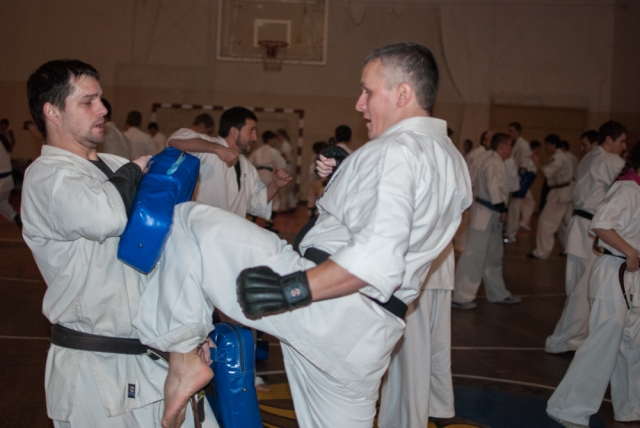 Вторая тема, которой было посвящено основное время тренировок – отработка техник лоу-кик, хиза-гери, маваши-гери и уширо-маваши в связках и комбинациях с другими ударами. Интересной была отработка этих связок с другими техниками, используемыми в тайском боксе, ММА (удары в голову, удары локтями, захваты). Всем участникам стало понятно, что Киокушин это не только узконаправленная соревновательная школа, а реальное боевое искусство, технику которого можно успешно применять и в других направлениях БИ. Наверное, привезенные с Таиланда навыки Шихан решил испробовать на своих бойцах. Справились ли они с поставленной задачей, известно только Шихану Всеволодву. Но тренировки были интересными и насыщенными с высоким темпом, а изобилие комбинаций не давало возможности отвлечься и расслабиться и уложиться в отведенные 2 часа для занятий было трудно.