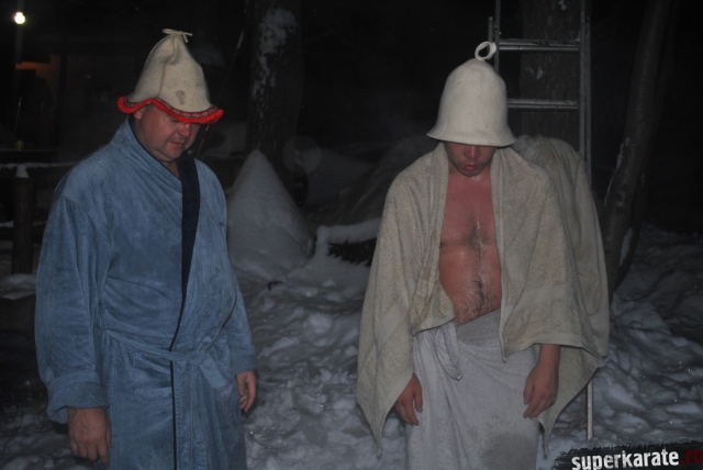 После купания бранч-чифы Кузнецов Андрей и Кузнецов Сергей организовали процесс согревания сэнсея Танаки так, что он был оперативно и профессионально прогрет и снаружи, и изнутри.