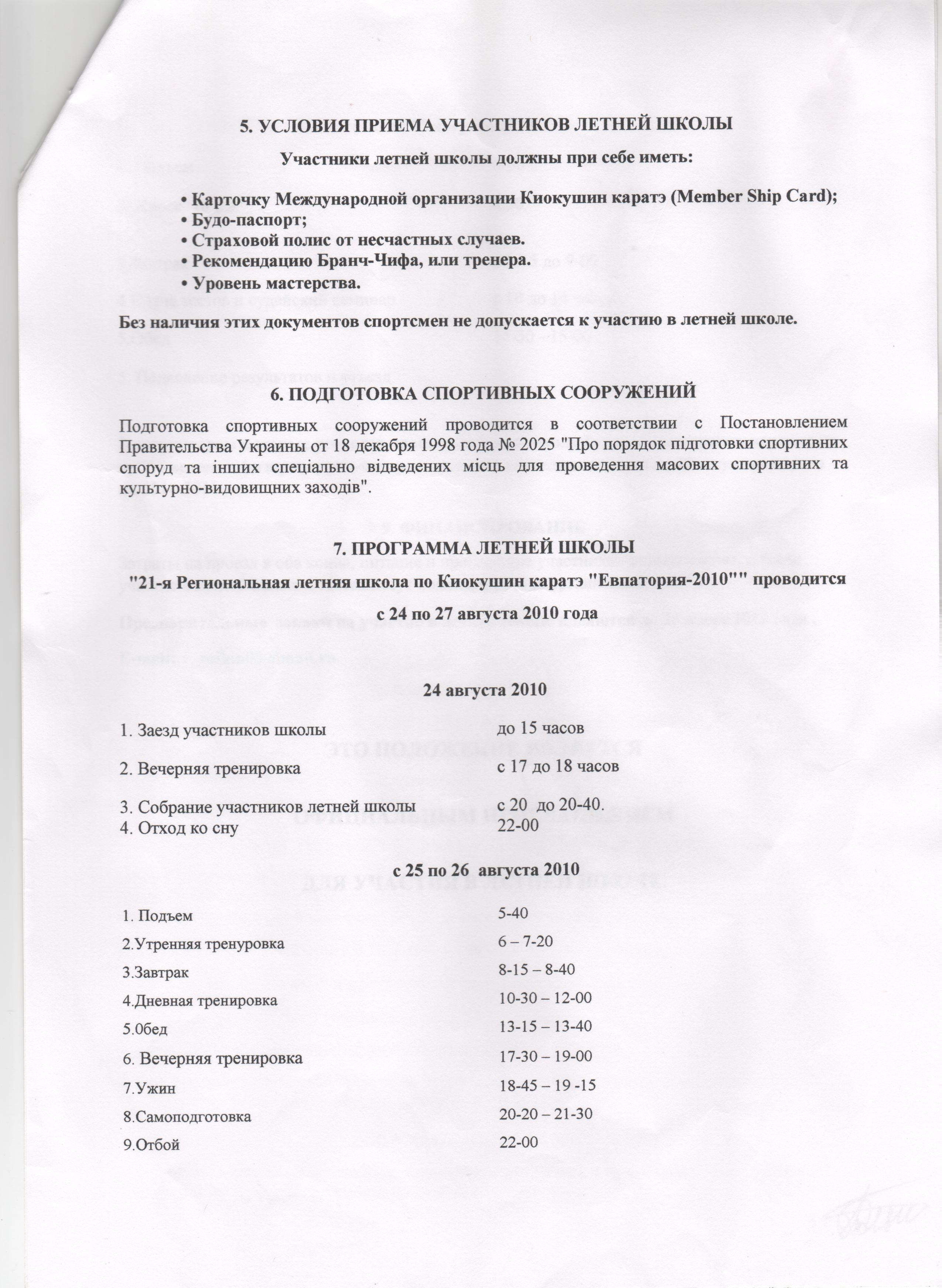 В программе лагеря: техническая, методическая подготовка, судейский семинар, экзамены по 2 дан включительно.