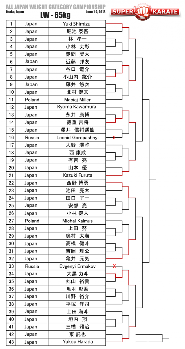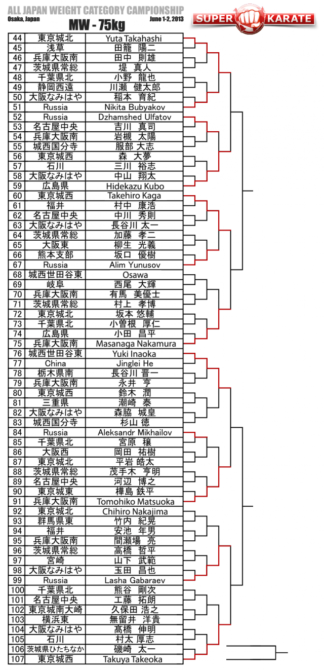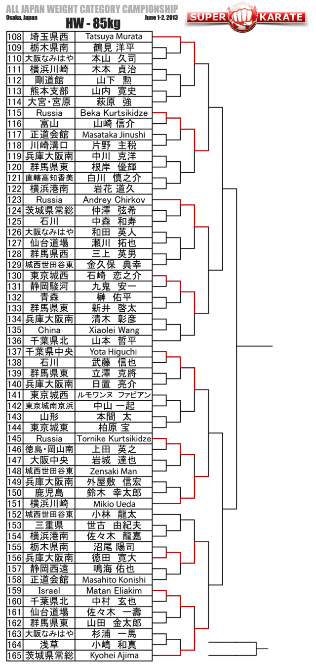 Закончился первый день весового Чемпионата Японии по киокушинкай, который проходит 1-2 июня 2013 года в Осаке, Токио. По итогам первого дня были отобраны восьмерки бойцов, которые вступят завтра в бои за медали. В числе вышедших во второй день соревнований российские бойцы: Лаша Габараев, Андрей Чирков, Бека Курцикидзе и Кирилл Кочнев.Наш украинский друг Александр Еременко, тоже прошел во второй день.