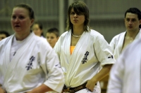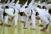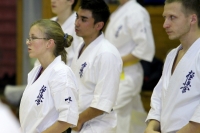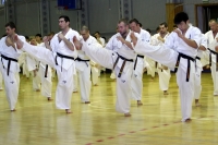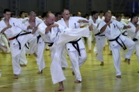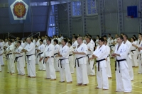 Участие в сборах строго с 5 кю, но несмотря на ограничения, в каждом ряду стоит по 26 человек. Давно не было сборов с таким количеством участников. Чтобы ведущих тренировку было лучше видно всем находящимся в зале, был установлен специальный подиум.