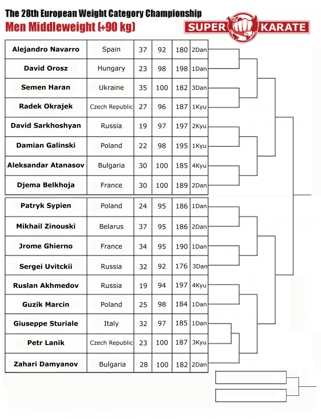 18 мая 2014 года в Варне, Болгария, стартует 28 Чемпионат Европы по каратэ киокушинкай. Впервые в истории европейский чемпионатов, российскую сборную допустили в сильнейшем составе. 15 наших мужчин проверят Европу на прочность. А с кем им придется встречаться на пути к подиуму, вы можете посмотреть по пулям.
