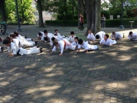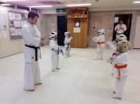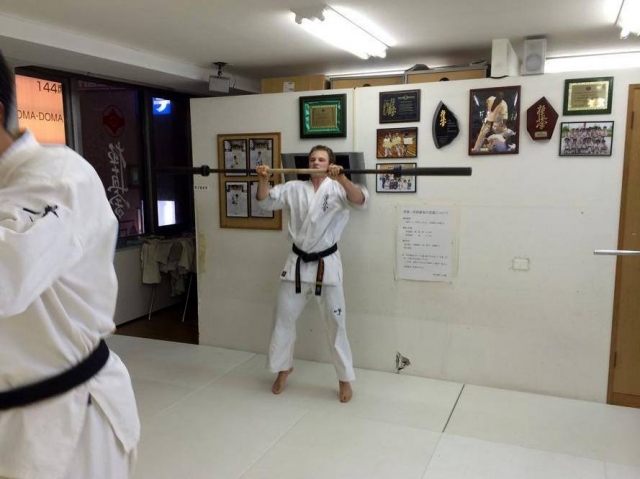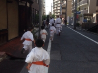 На детских тренировках перенимаем опыт, иногда сами ведем небольшие отрывки тренировок. Общение с детьми на англо-японо-русском языке очень забавляет как нас, так и японских детей. Иногда делаем с детьми кихон.
