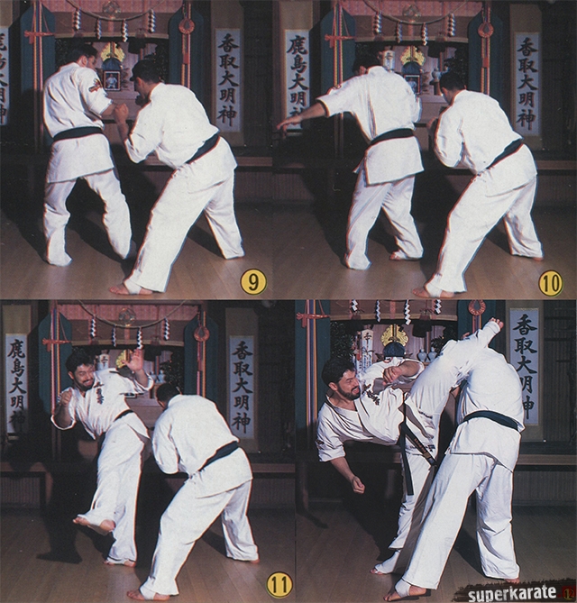 9-12. Используя инерцию вращения после своего лоу-кика, не останавливая движения переходим к удару уширо маваши гери джодан другой ногой. Переход от удара к удару должен происходить в одном потоке (без пауз), только так можно эффективно использовать потерю равновесия соперником, после выбитой у него опорной ноги.