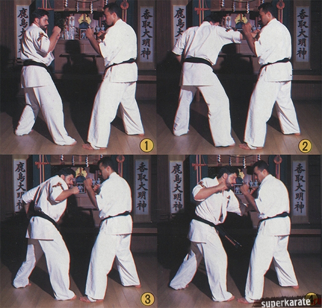 1-4. Мощно атакуем связкой ударов ой-цуки+гяку-цуки. Передней прямой ставим противника плотно на две ноги, дальней рукой ударом шито цуки, заставляем соперника сконцентрироваться на защите и плотно загрузить разноименную ногу. Второй удар выполняем амплитудно и с мощным скручиванием своего корпуса.