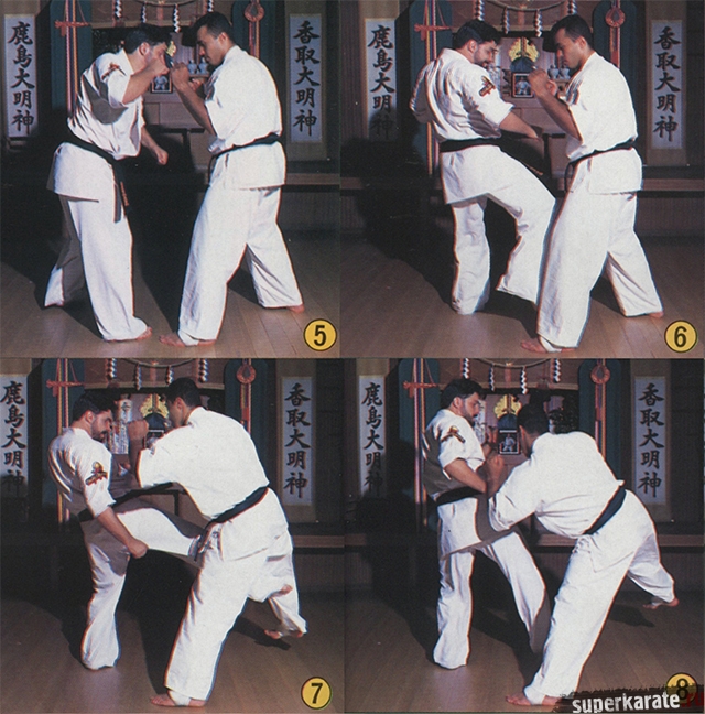 5-8. Используя скручивание полученное на связке руками, как пружину, "раскручиваясь" влетаем внутренним лоу-киком в ногу соперника. Бить нужно так, чтобы ваша голень попадала в колено соперника. Главное в этом лоу-кике бить не "по", а "в" ногу противника. Удар должен быть с не фиксируемым проносом (т.е. не стремитесь найти точку опоры, а всю связку работайте используя инерцию).