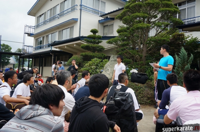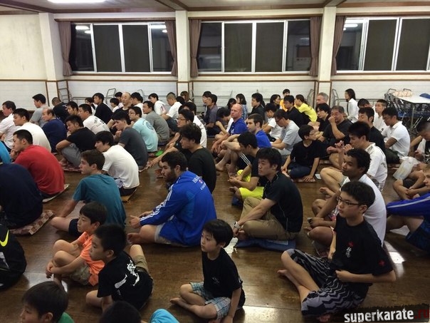 Общее собрание. Все сидят на полу в соответствии своим комнатам, в линию. Около 2 часов Канчо Мацуи говорил о каратэ, технике, прошедших и будущих мероприятиях, о Сосае... Иногда шутил. Все смеялись, кроме нескольких человек не владеющих японским.