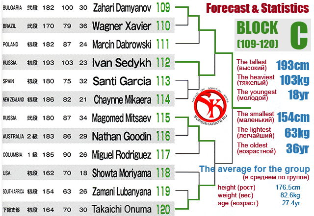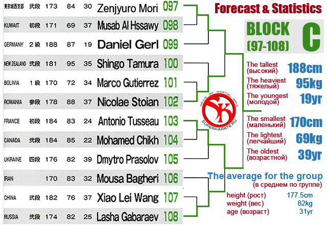 До 11 абсолютного Чемпионата мира по киокушинкай IKO остается совсем немного времени и мы предлагаем вашему вниманию статистику «Блока С». Мы уже подробно разбирали «Блок А» и «Блок В», и вы можете самостоятельно сравнивать их между собой. Лидерами «Блока С» являются два обладателя наивысшего технического мастерства в современном киокушине - Зенжуро Мори и Александр Еременко. Именно эти бойцы способны показать соперникам и зрителям всю красоту и силу киокушина.