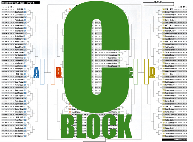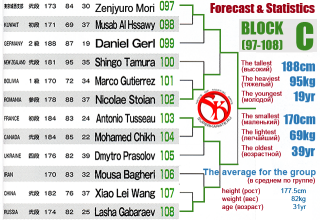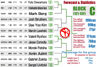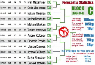 «Блок С» стартует с поединка самого техничного бойца японской сборной Зенжуро Мори (Zenjyuro Mori) №97, который скорее всего будет претендовать на место в итоговой восьмерке. Замыкает этот блок Александр Еременко (Oleksandr Ieremenko) №144, главный претендент на победу в «Блоке С» и один из основных претендентов на чемпионство.